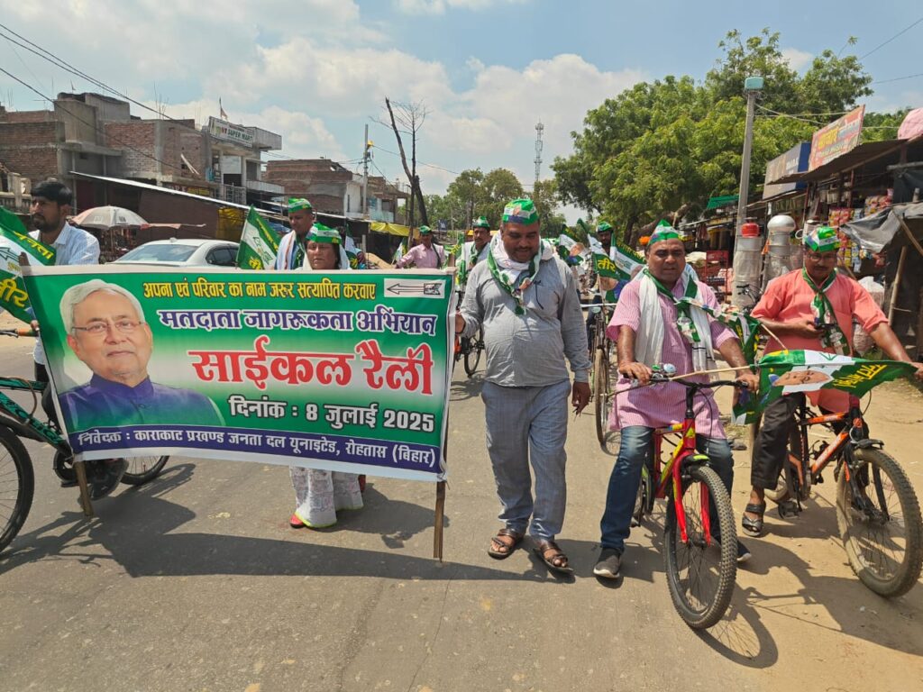 काराकाट विधानसभा क्षेत्र के विभिन्न प्रखंड में मतदाता जागरूकता अभियान के तहत साइकिल रैली का आयोजन किया गया। जिसका नेतृत्व अरुणा सिंह, सदस्य राज्य परिषद (जदयू) बिहार सह प्रभारी तरारी विधानसभा ने किया। रैली काराकाट बाजार से चलकर काराकाट, मुंजी, जमुआ, गोड़ारी, दनवार सहित विभिन्न पंचायतों के विभिन्न गावों में पहुंच कर मतदाताओं को जागरूक किया। अरूणा देवी ने इस दौरान लोगों को संबोधित करते हुए कहा कि लोकतंत्र की मजबूती के लिए मतदाताओं को जागरूक होना आवश्यक है। वे अपने अधिकार के प्रति जागरूक होंगे तभी लोकतंत्र मजबूत होगा और जब लोकतंत्र मजबूत होगा तो देश, राज्य और क्षेत्र का विकास होगा। उन्होंने रैली के महत्व की चर्चा करते हुए कहा इस अभियान के तहत लोगों को मतदान के महत्व के बारे में बताया गया। उन्हें अपने मताधिकार का प्रयोग करने के लिए प्रोत्साहित किया गया। इस कार्यक्रम में बड़ी संख्या में कार्यकर्ता और आमलोगों ने हिस्सा लिया। रैली में प्रखंड अध्यक्ष आशुतोष सिंह, 20 सूत्री सदस्य जयशंकर पटेल, जिला उपाध्यक्ष वीरेंद्र कुशवाहा सहित कई लोगों ने भाग लिया।